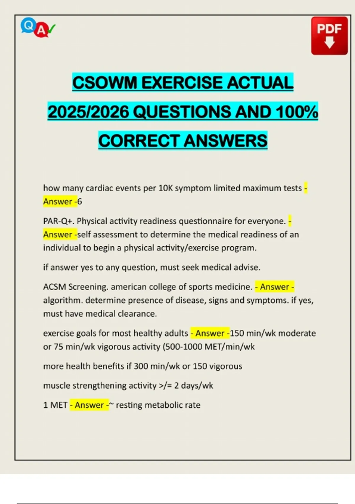 CSOWM EXERCISE ACTUAL 2025/2026 QUESTIONS AND 100% CORRECT ANSWERS how many cardiac events per 10K symptom limited maximum tests - Answer -6 PAR-Q+. Physical activity readiness questionnaire for everyone. - Answer -self assessment to determine the medical readiness of an individual to begin a physical activity/exercise program. if answer yes to any question, must seek medical advise. ACSM Screening. american col