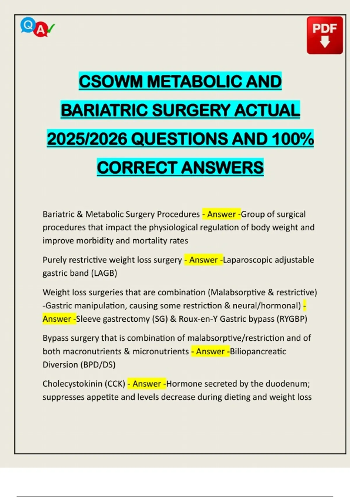 CSOWM METABOLIC AND BARIATRIC SURGERY ACTUAL 2025/2026 QUESTIONS AND 100% CORRECT ANSWERS Bariatric & Metabolic Surgery Procedures - Answer -Group of surgical procedures that impact the physiological regulation of body weight and improve morbidity and mortality rates Purely restrictive weight loss surgery - Answer -Laparoscopic adjustable gastric band (LAGB) Weight loss surgeries that are combination (Malabsorptive & restrictive) -Gastric manipulation, causing some restriction & neural/hormonal) - Answer -Sleeve gastrectomy (SG) & Roux-en-Y Gastric bypass (RYGBP) Bypass surgery that is combination of malabsorptive/restriction and of both macronutrients & micronutrients - Answer -Biliopancreatic Diversion (BPD/DS)