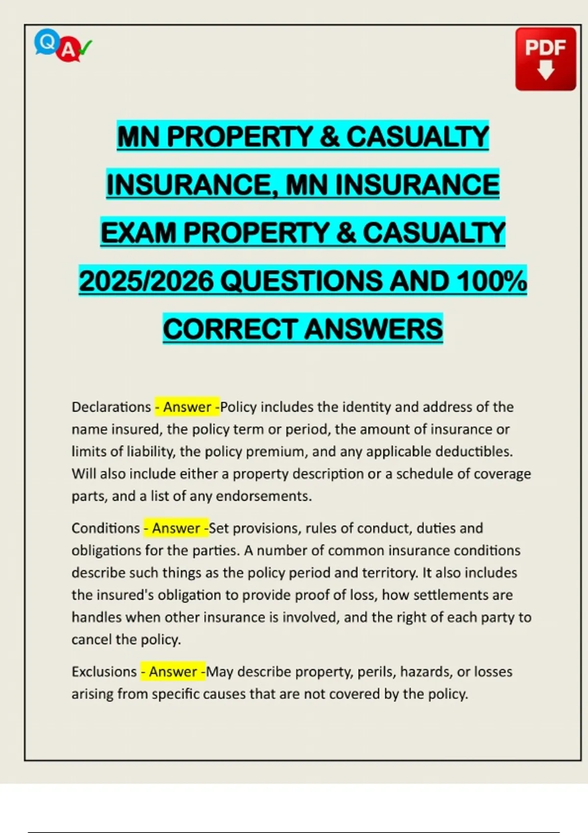 MN PROPERTY & CASUALTY INSURANCE, MN INSURANCE EXAM PROPERTY & CASUALTY 2025/2026 QUESTIONS AND 100% CORRECT ANSWERS Declarations - Answer -Policy includes the identity and address of the name insured, the policy term or period, the amount of insurance or limits of liability, the policy premium, and any applicable deductibles. Will also include either a property description or a schedule of coverage parts, and a list of any endorsements. Conditions - Answer -Set provisions, rules of conduct, duties and obligations for the parties. A number of common insurance conditions describe such things as the policy period and territory. It also includes the insured's obligation to provide proof of loss, how settlements are handles when other insurance is involved, and the right of each party to cancel the policy. Exclusions - Answer -May describe property, perils, hazards, or