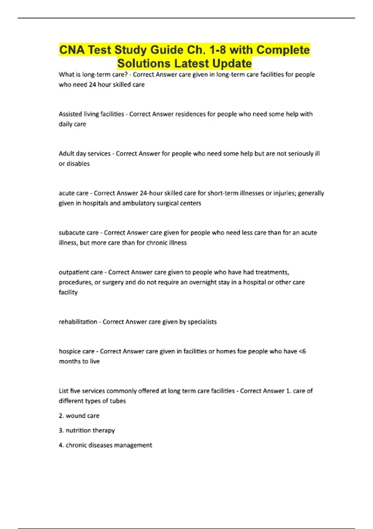 CNA Test Study Guide Ch. 1-8 with Complete Solutions Latest Update What is long-term care? - Correct Answer care given in long-term care facilities for people who need 24 hour skilled care Assisted living facilities - Correct Answer residences for people who need some help with daily care Adult day services - Correct Answer for people who need some help but are not seriously ill or disables acute care - Correct Answer 24-hour skilled care for short-term illnesses or injuries; generally given in hospitals and ambulatory surgical centers subacute care - Correct Answer care given for people who need less care than for an acute illness, but more care than for chronic illness outpatient care - Correct Answer care given to people who have had treatments, procedures, or surgery and do not require an overnight stay in a hospital or other care facility rehabilitation - Correct Answer care given by specialists hospice care - Correct Answer care given in facilities or homes foe people who have 6 months to live List five services commonly offered at long term care facilities - Correct Answer 1. care of different types of tubes 2. wound care 3. nutrition therapy 4. chronic diseases management