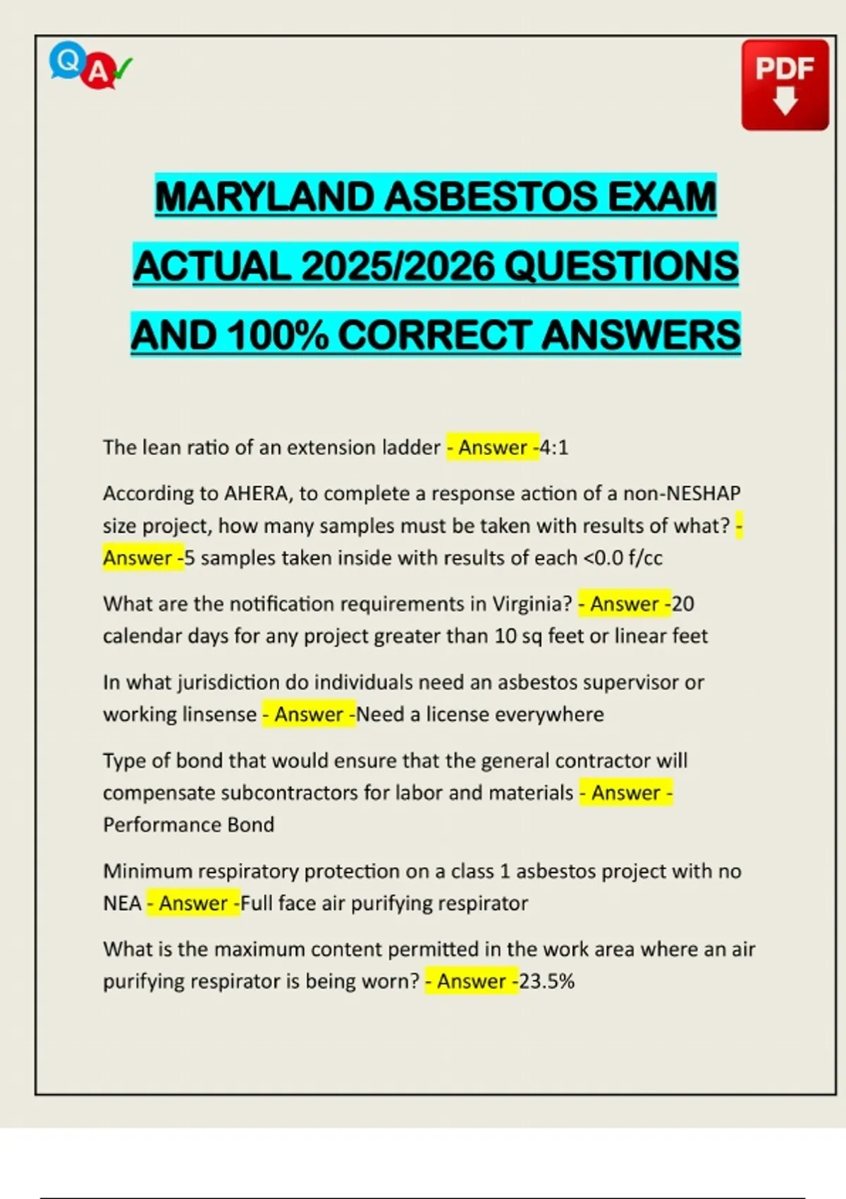 MARYLAND ASBESTOS EXAM ACTUAL 2025/2026 QUESTIONS AND 100% CORRECT ANSWERS The lean ratio of an extension ladder - Answer -4:1 According to AHERA, to complete a response action of a non-NESHAP size project, how many samples must be taken with results of what? - Answer -5 samples taken inside with results of each <0.0 f/cc What are the notification requirements in Virginia? - Answer -20 calendar days for any project greater than 10 sq feet or linear feet In what jurisdiction do individuals need an asbestos supervisor or working linsense - Answer -Need