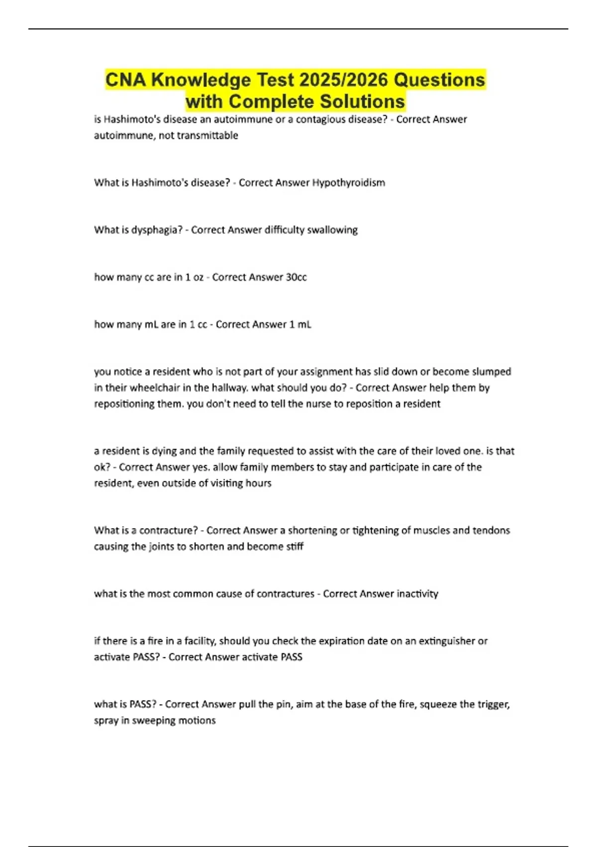 CNA Knowledge Test 2025/2026 Questions with Complete Solutions is Hashimoto's disease an autoimmune or a contagious disease? - Correct Answer autoimmune, not transmittable What is Hashimoto's disease? - Correct Answer Hypothyroidism What is dysphagia? - Correct Answer difficulty swallowing how many cc are in 1 oz - Correct Answer 30cc how many mL are in 1 cc - Correct Answer 1 mL you notice a resident who is not part of your assignment has slid down or become slumped in their wheelchair in the hallway. what should you do? - Correct Answer help them by repositioning them. you don't need to tell the nurse to reposition a resident a resident is dying and the family requested to assist with the care of their loved one. is that ok? - Correct Answer yes. allow family members to stay and participate in care of the resident, even outside of visiting hours What is a contracture? - Correct Answer a shortening or tightening of muscles and tendons causing the joints to shorten and become stiff what is the most common cause of contractures - Correct Answer inactivity if there is a fire in a facility, should you check the expiration date on an extinguisher or activate PASS? - Correct Answer activate PASS