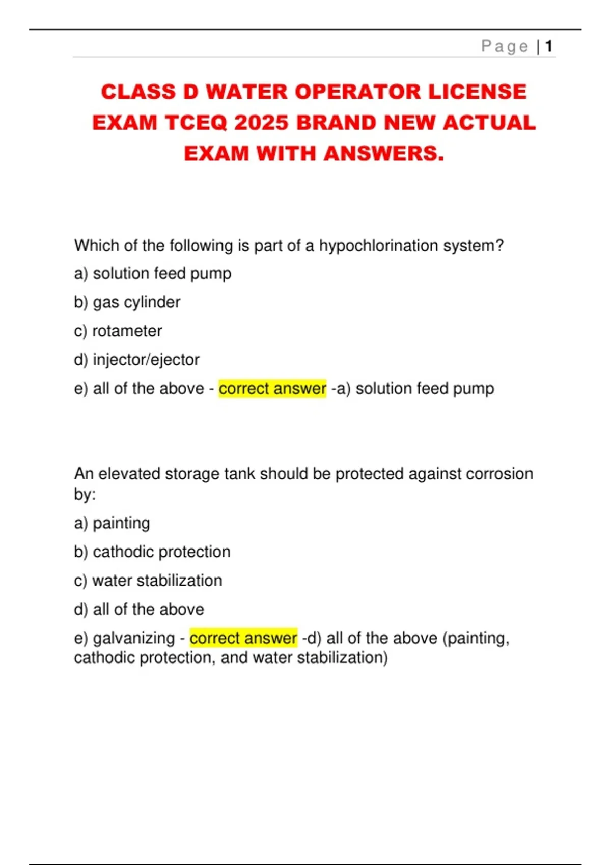 CLASS D WATER OPERATOR LICENSE EXAM TCEQ 2025 BRAND NEW ACTUAL EXAM WITH ANSWERS.