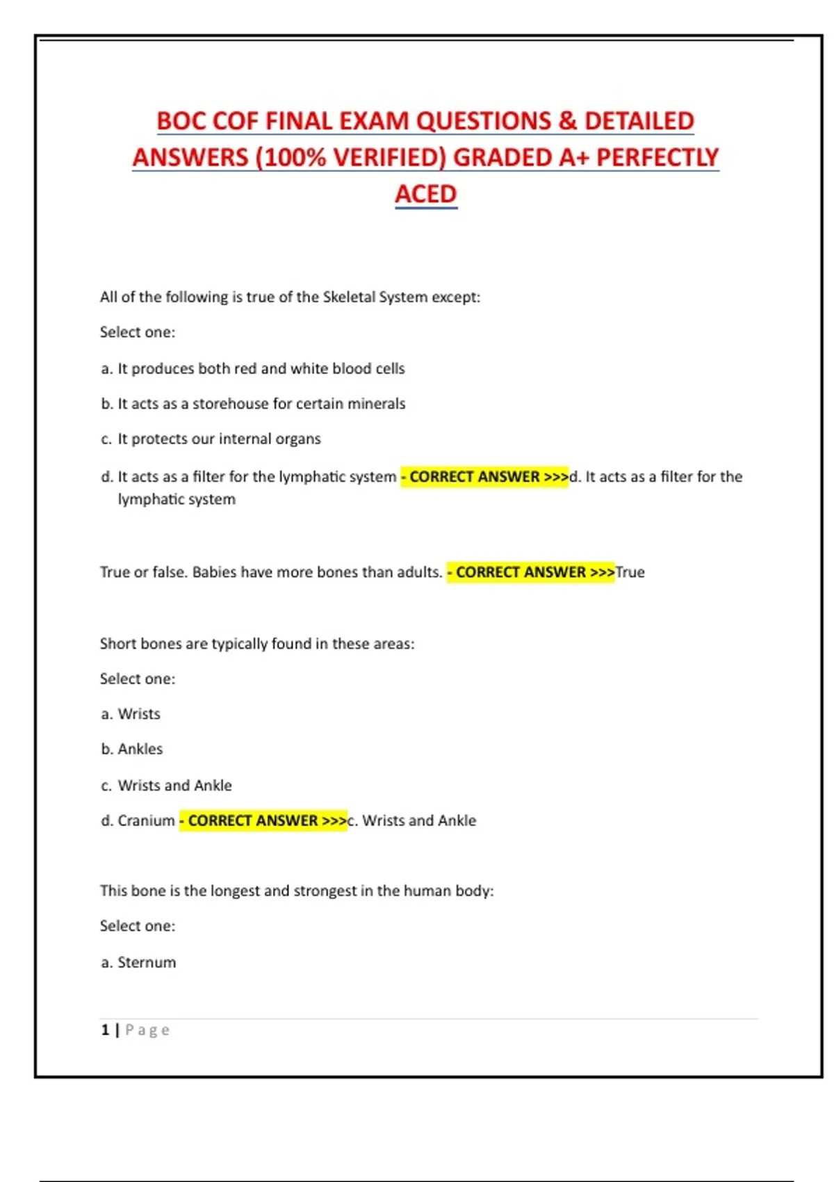 d. Femur - CORRECT ANSWER >>>d. Femur