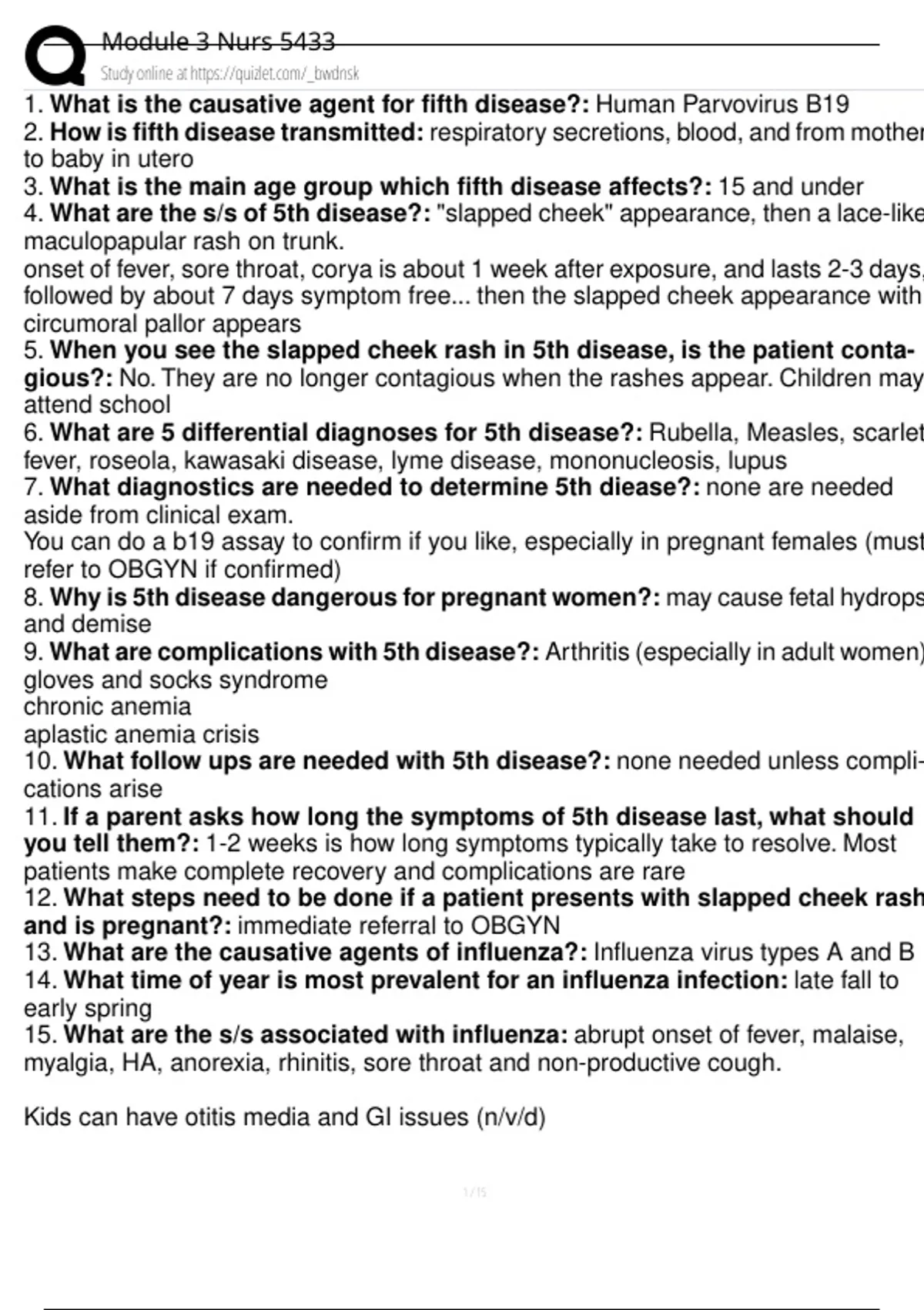 What is the causative agent for fifth disease?: Human Parvovirus B19 2. How is fifth disease transmitted: respiratory secretions, blood, and from mother to baby in utero 3. What is the main age group which fifth disease affects?: 15 and under 4. What are the s/s of 5th disease?: "slapped cheek" appearance, then a lace-like maculopapular rash on trunk. onset of fever, sore throat, corya is about 1 week after exposure, and lasts 2-3 days, followed by about 7 days symptom free... then the slapped cheek appearance with circumoral pallor appears 5. When you see the slapped cheek rash in 5th disease, is the patient conta- gious?: No. T
