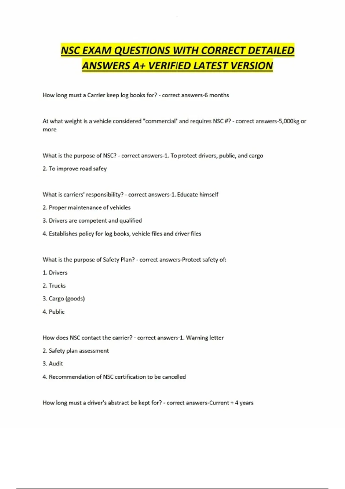 NSC EXAM QUESTIONS WITH CORRECT DETAILED ANSWERS A+ VERIFIED LATEST VERSION How long must a Carrier keep log books for? - correct answers-6 months At what weight is a vehicle considered "commercial" and requires NSC #? - correct answers-5,000kg or more What is the purpose of NSC? - correct answers-1. To protect drivers, public, and cargo 2. To improve road safey What is carriers' responsibility? - correct answers-1. Educate himself 2. Proper maintenance of vehicles 3. Drivers are competent and qualified 4. Establishes policy for log books, vehicle files and driver files What is the purpose of Safety Plan? - correct answers-Protect safety of: 1. Drivers 2. Trucks 3. Cargo (goods) 4. Public