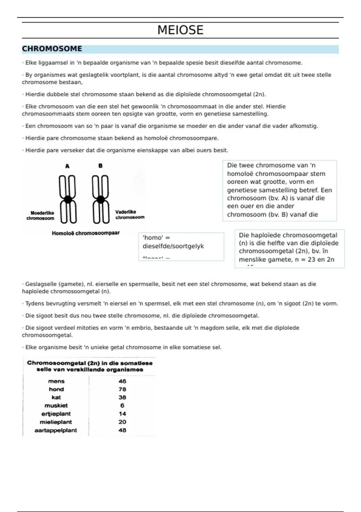 · Geslagselle (gamete), nl. eierselle en spermselle, besit net een stel chromosome, wat bekend staan as die