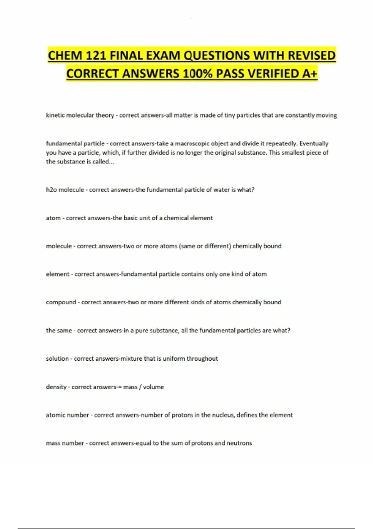 CHEM 121 FINAL EXAM QUESTIONS WITH REVISED CORRECT ANSWERS 100% PASS VERIFIED A+ kinetic molecular theory - correct answers-all matter is made of tiny particles that are constantly moving fundamental particle - correct answers-take a macroscopic object and divide it repeatedly. Eventually you have a particle, which, if further divided is no longer the original substance. This smallest piece of the substance is called... h2o molecule - correct answers-the fundamental particle of water is what? atom - correct answers-the basic unit of a chemical element molecule - correct answers-two or more atoms (same or different) chemically bound element - correct answers-fundamental particle contains only one kind of atom compound - correct answers-two or more different kinds of atoms chemically bound