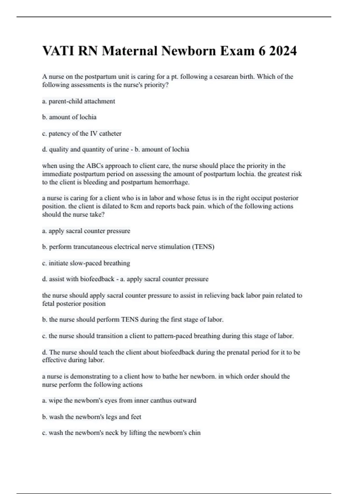 VATI RN Maternal Newborn Exam 6 2020 | question answers