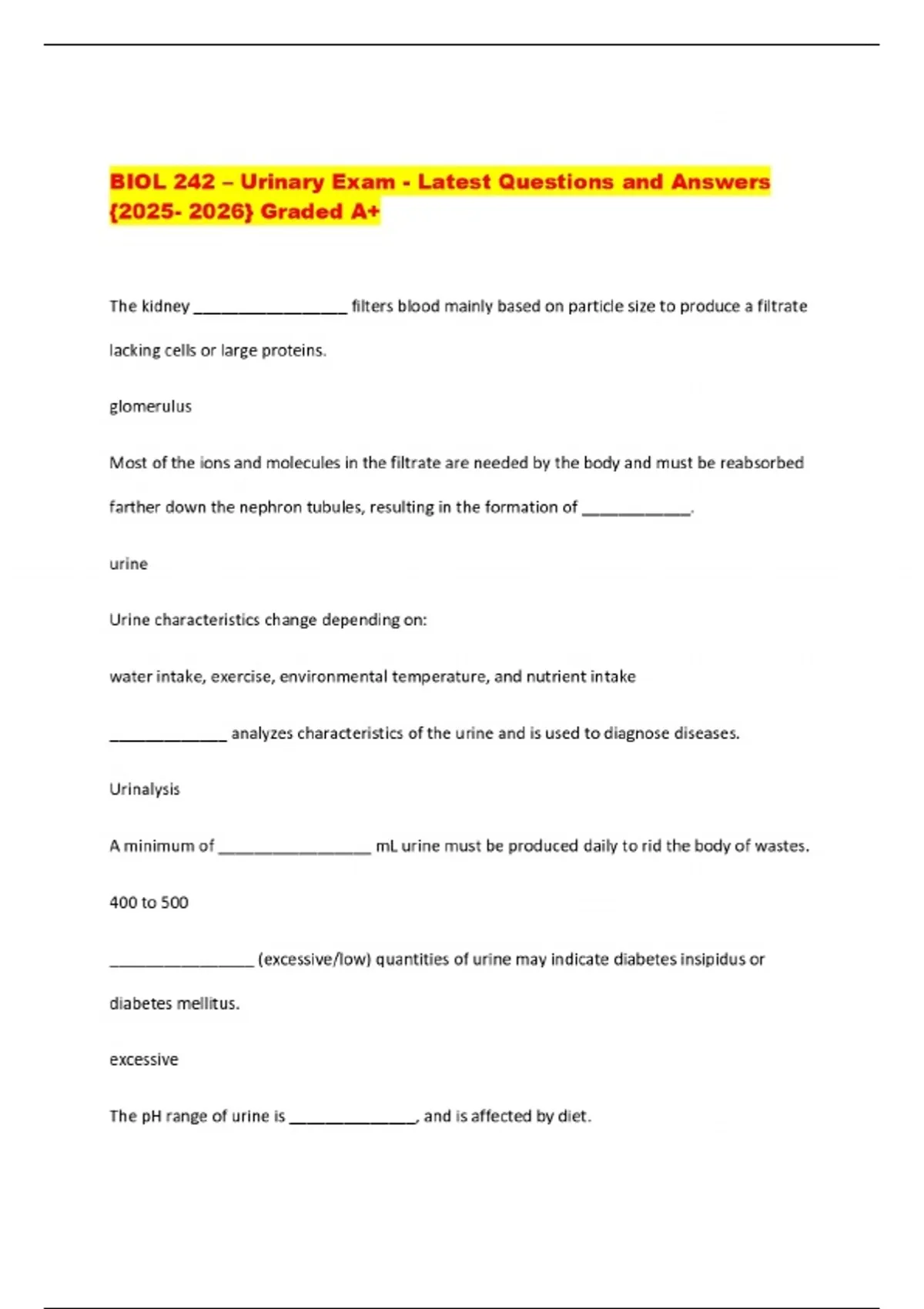 BIOL 242 – Urinary Exam - Latest Questions and Answers {} Graded A+