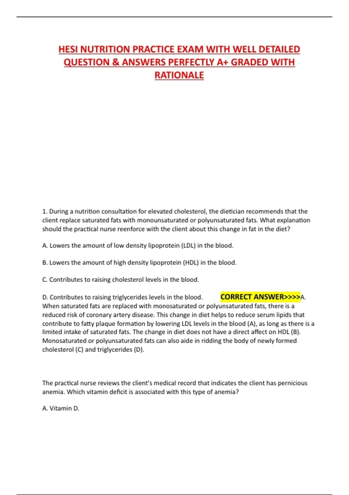 HESI NUTRITION PRACTICE EXAM WITH WELL DETAILED