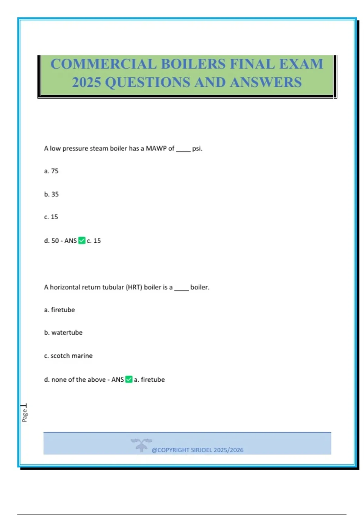 A low pressure steam boiler has a MAWP of ____ psi. a. 75 b. 35 c. 15 d. 50 - ANS c. 15 A horizontal return tubular (HRT) boiler is a ____ boiler. a. firetube b. watertube c. scotch marine d. none of the above - ANS a. firetube COMMERCIAL BOILERS FINAL EXAM 2025 QUESTIONS AND ANSWERS @COPYRIGHT SIRJOEL 2025/2026 Page2 Some watertube boilers are equipped with ____ to increase the heating surface and the life of the furnace refractory. a. stays b. baffles c. brickwork d. waterwalls - ANS d. waterwalls Watertube boilers were designed to operate at pressures as high as ____ psi, a point known as the critical pressure of steam. a. 512 b. 5000 c. 1015 d. 3205 - ANS d. 3205 Boiler tubes are manufactured using materials that meet ____ specifications. a. DOE b. ASME @COPYRIGHT SIRJOEL 2025/2026 Page3 c. ABMA d. ASTM - ANS b. ASME The boiler superheater raises the temperature of the ____. a. steam leaving the boiler b. air for combustion c. gases for combustion d. feedwater - ANS a. steam leaving the boiler At 0 psig, how many BTU are necessary to change one lb of water at 212 F into 1 lb of steam? a. 1,190 b. 970 c. 144 d. 180 - ANS b. 970 Steam at 100 psi an