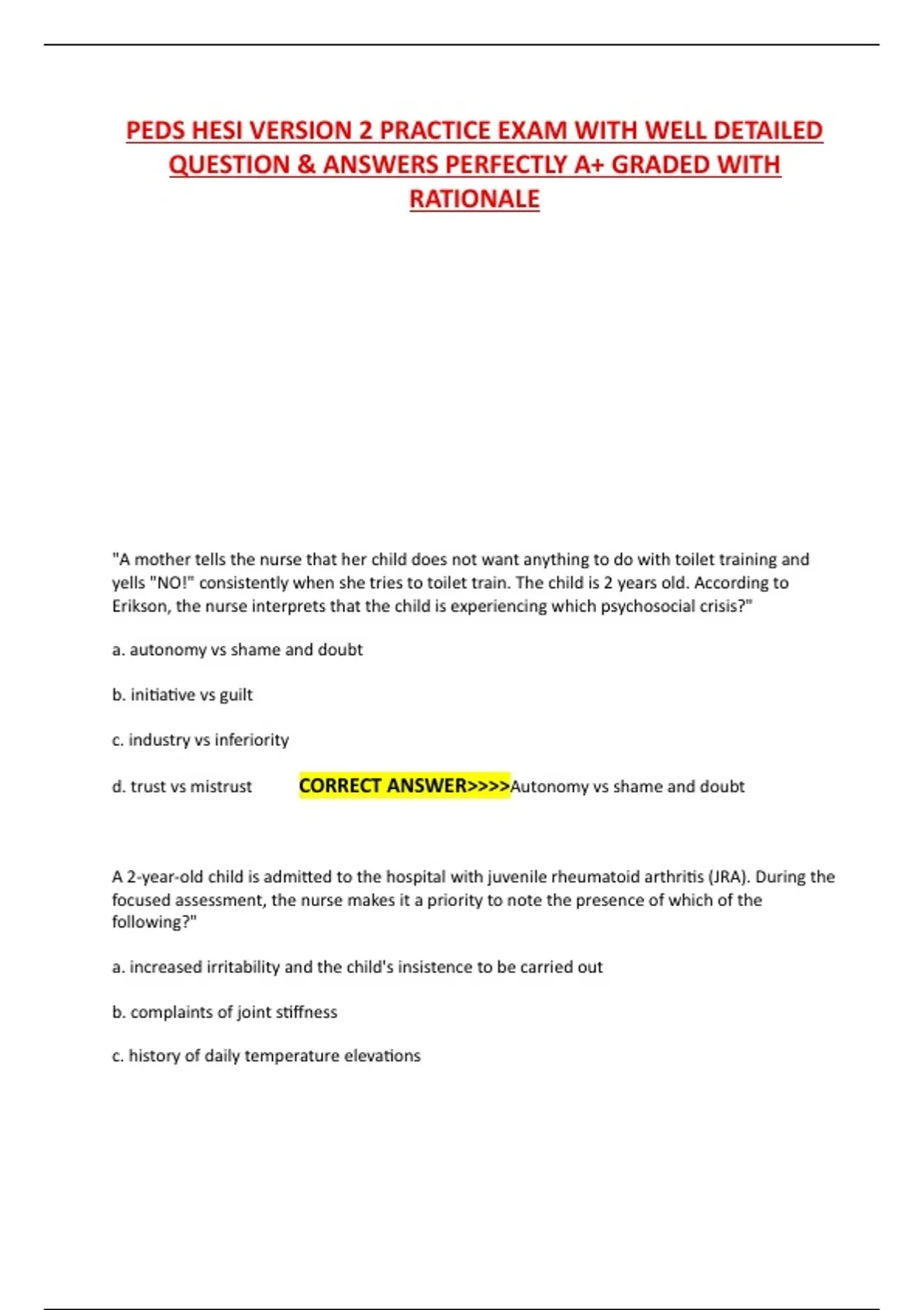 PEDS HESI VERSION 2 PRACTICE EXAM WITH WELL DETAILED