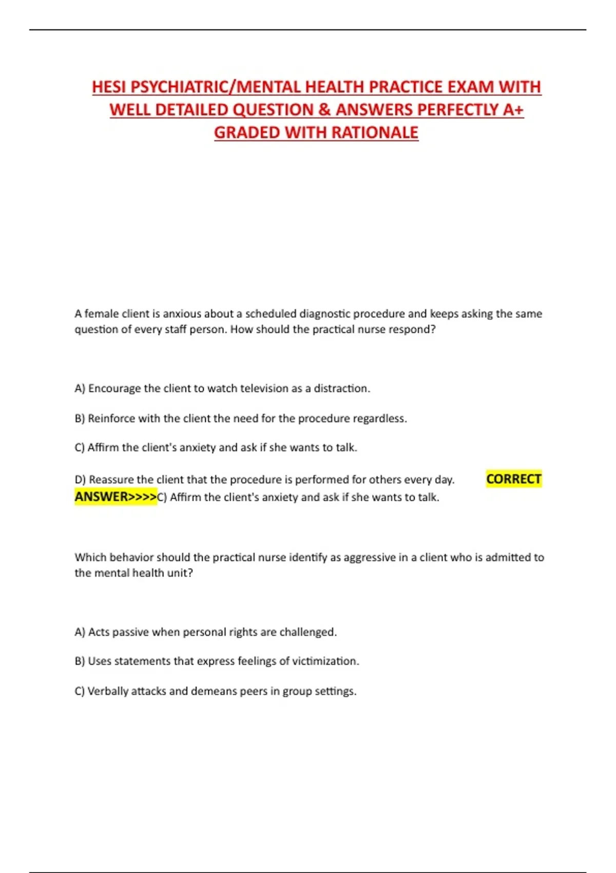 HESI PSYCHIATRIC/MENTAL HEALTH PRACTICE EXAM WITH