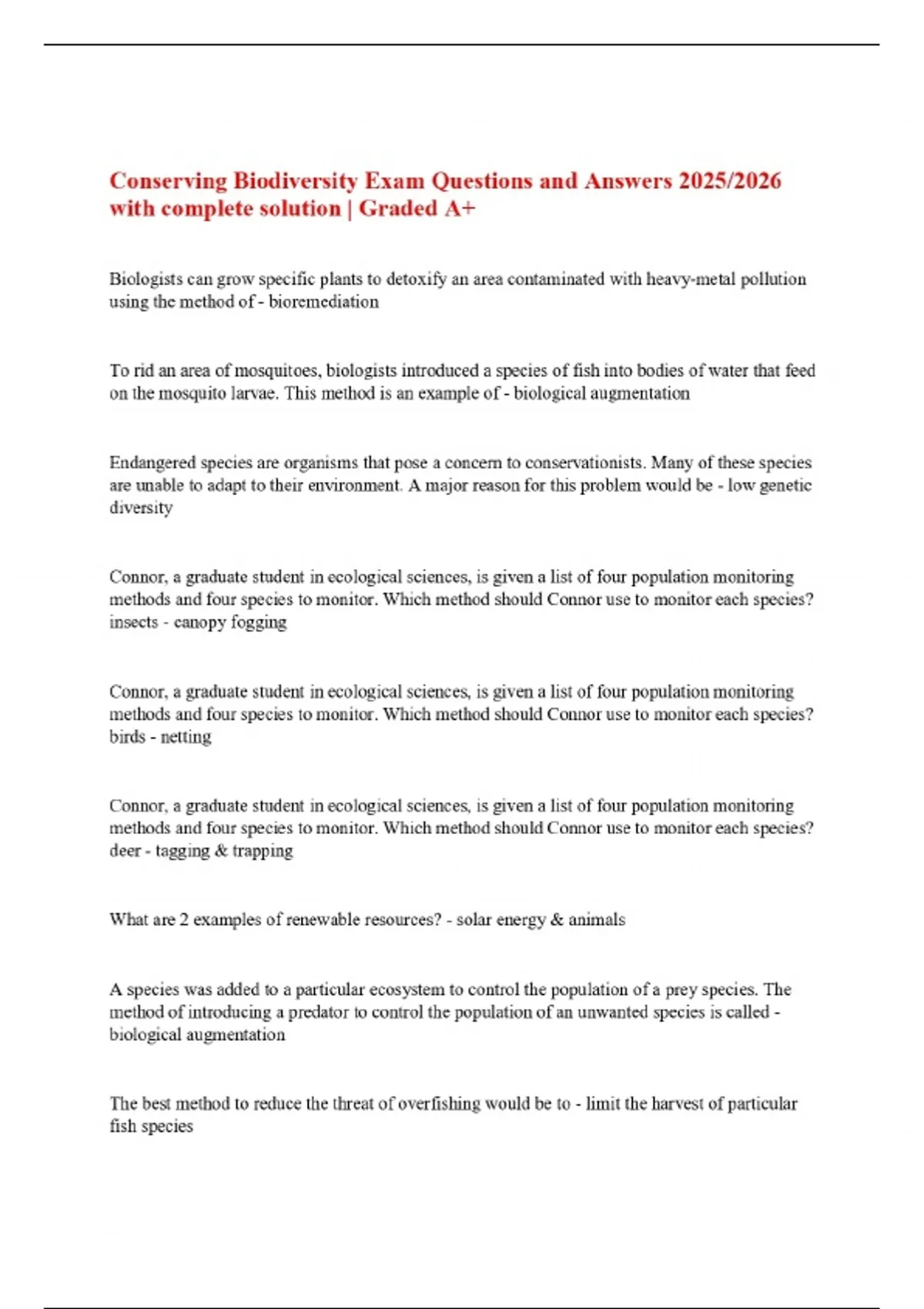 Conserving Biodiversity Exam Questions and Answers 2025/2026 with complete solution | Graded A+
