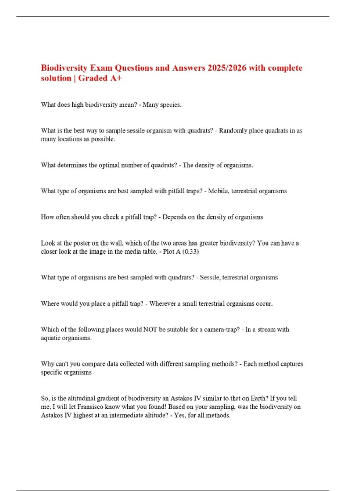Biodiversity Exam Questions and Answers 2025/2026 with complete solution | Graded A+