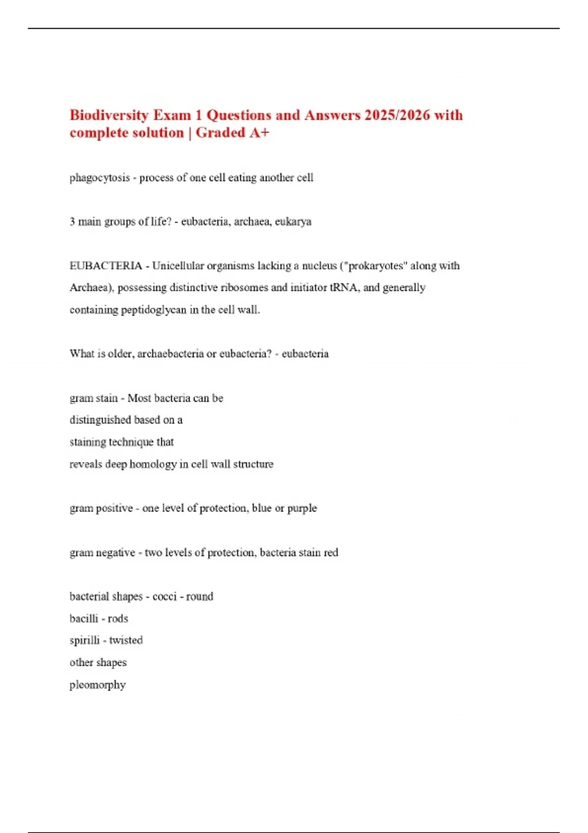 Biodiversity Exam 1 Questions and Answers 2025/2026 with complete solution | Graded A+