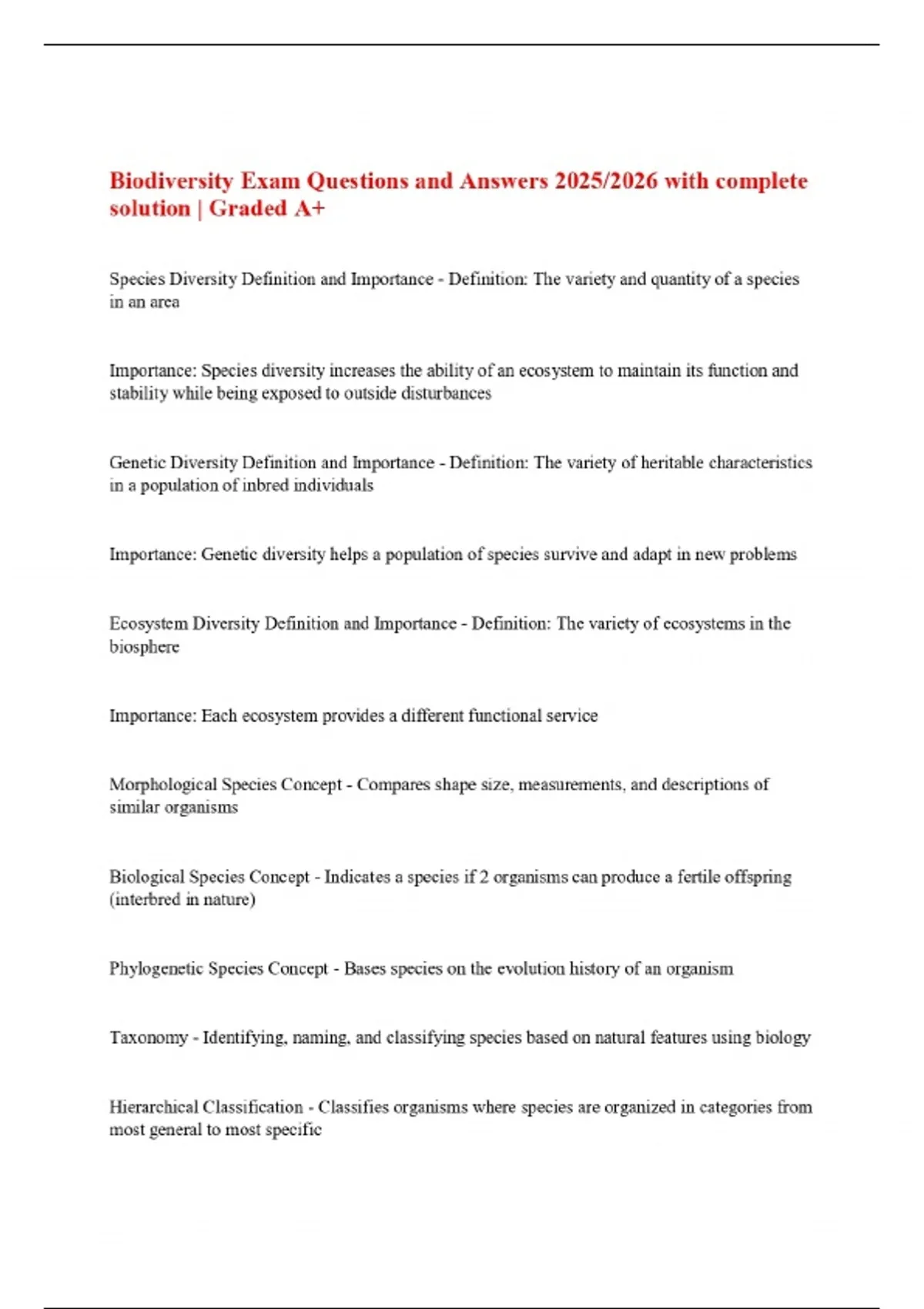 Biodiversity Exam Questions and Answers 2025/2026 with complete solution | Graded A+