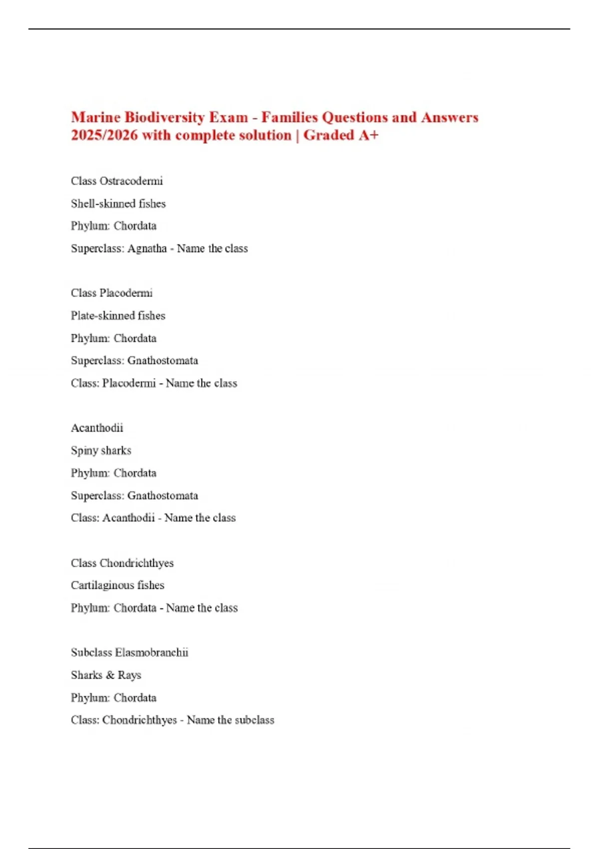 Marine Biodiversity Exam - Families Questions and Answers 2025/2026 with complete solution | Graded A+