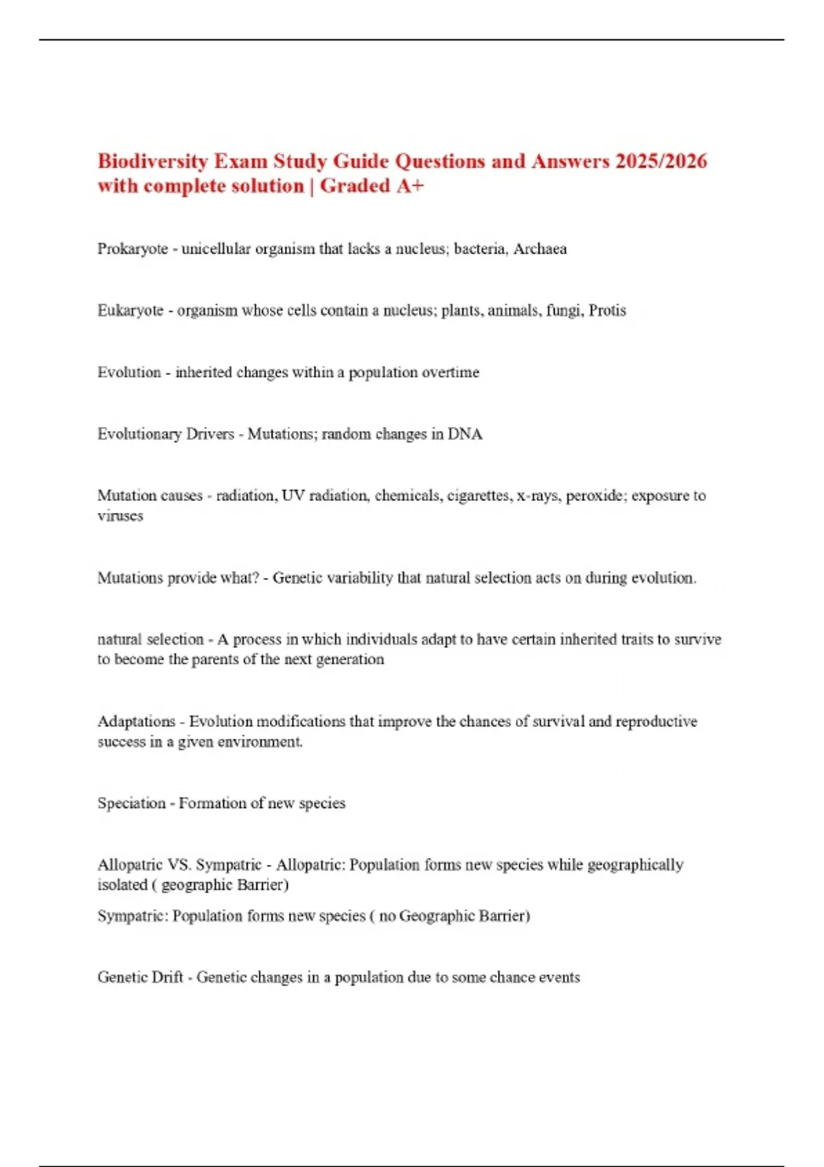 Biodiversity Exam Study Guide Questions and Answers 2025/2026 with complete solution | Graded A+