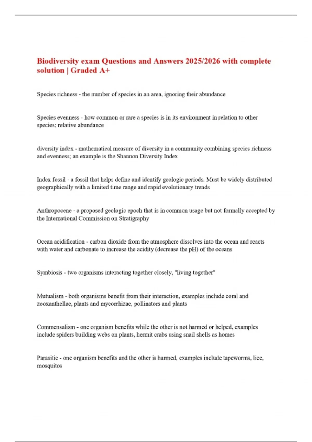 Biodiversity exam Questions and Answers 2025/2026 with complete solution | Graded A+
