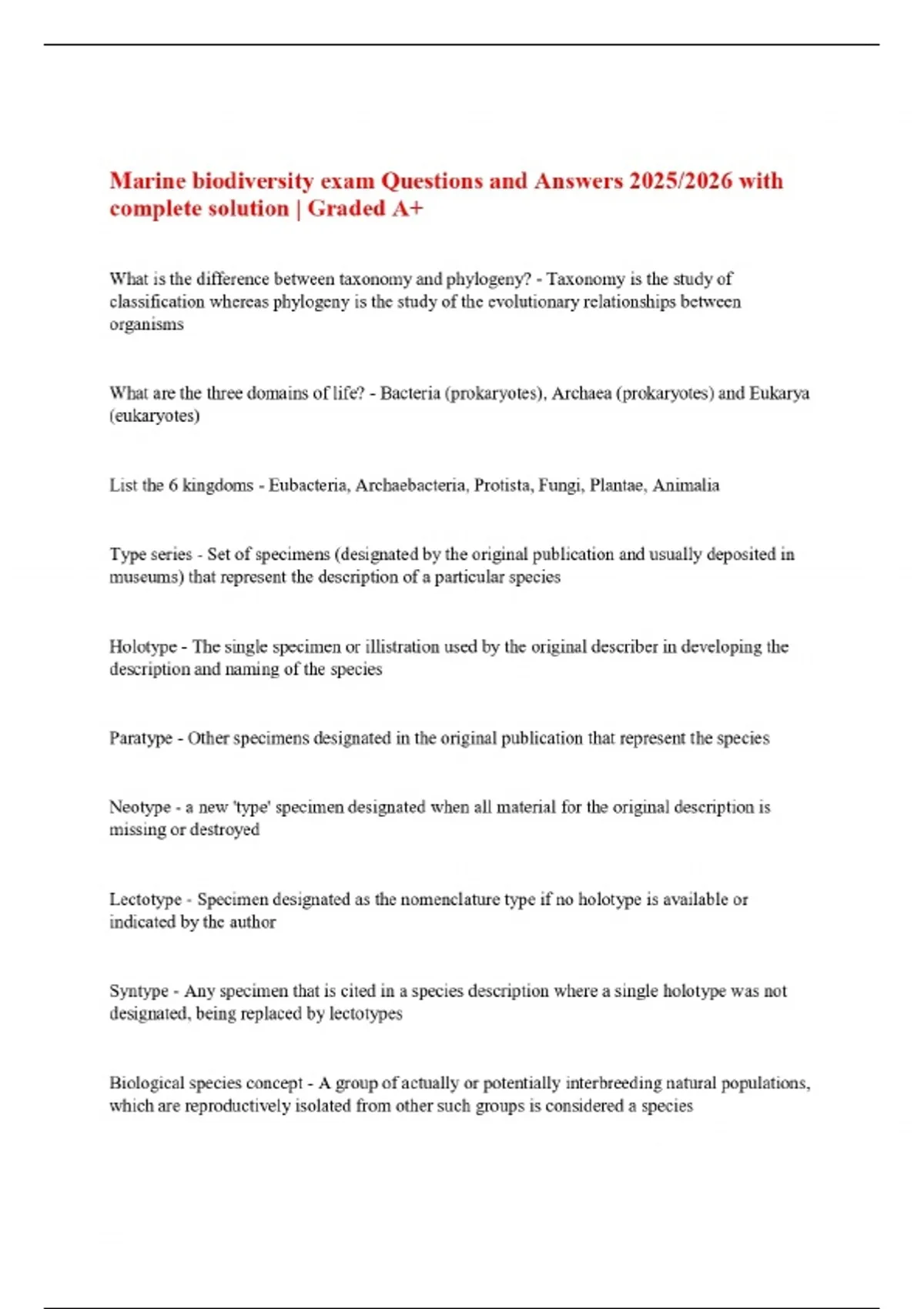 Marine biodiversity exam Questions and Answers 2025/2026 with complete solution | Graded A+