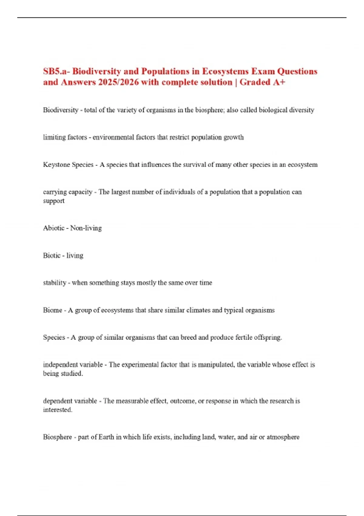 SB5.a- Biodiversity and Populations in Ecosystems Exam Questions and Answers 2025/2026 with complete solution | Graded A+