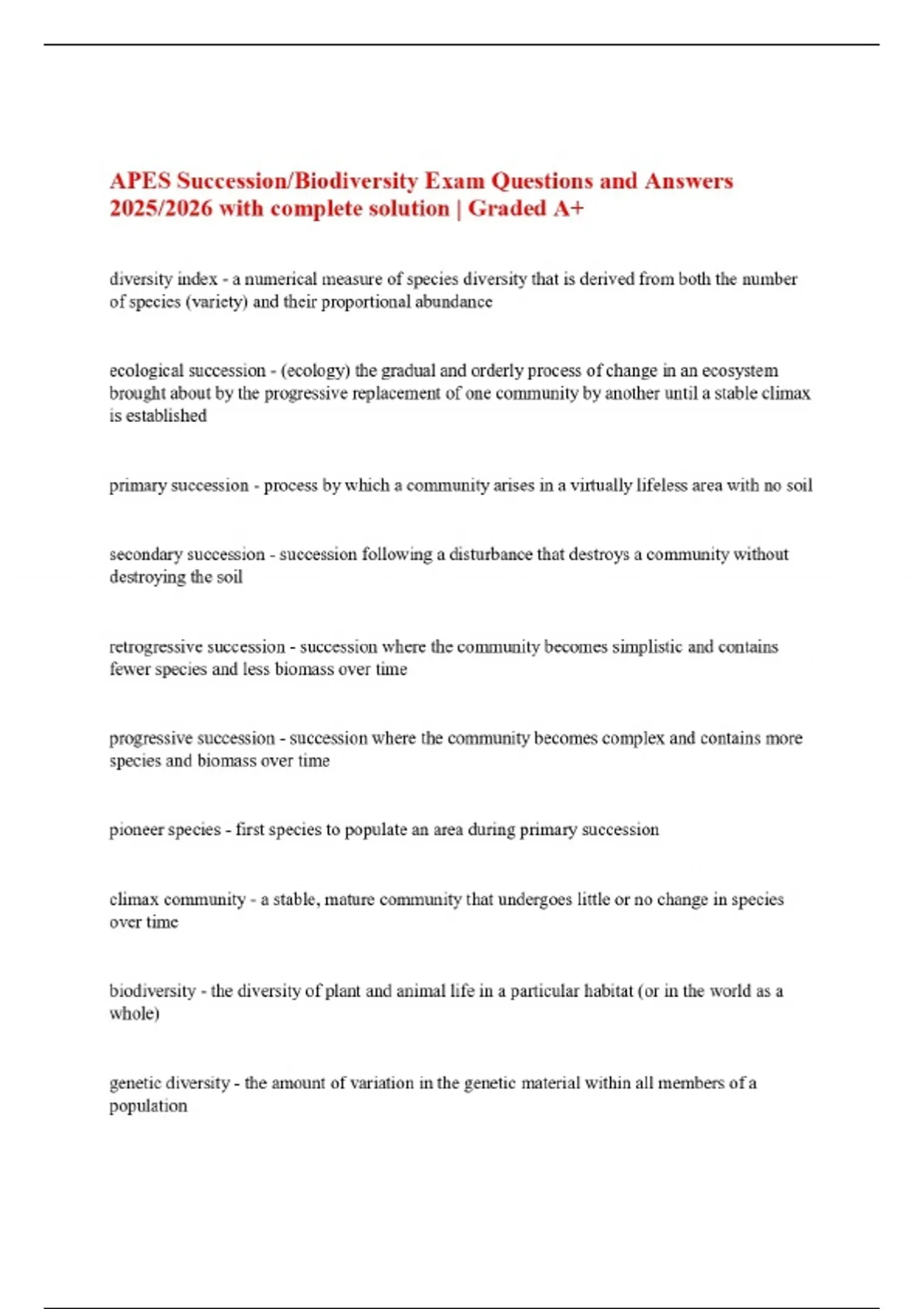 APES Succession/Biodiversity Exam Questions and Answers 2025/2026 with complete solution | Graded A+