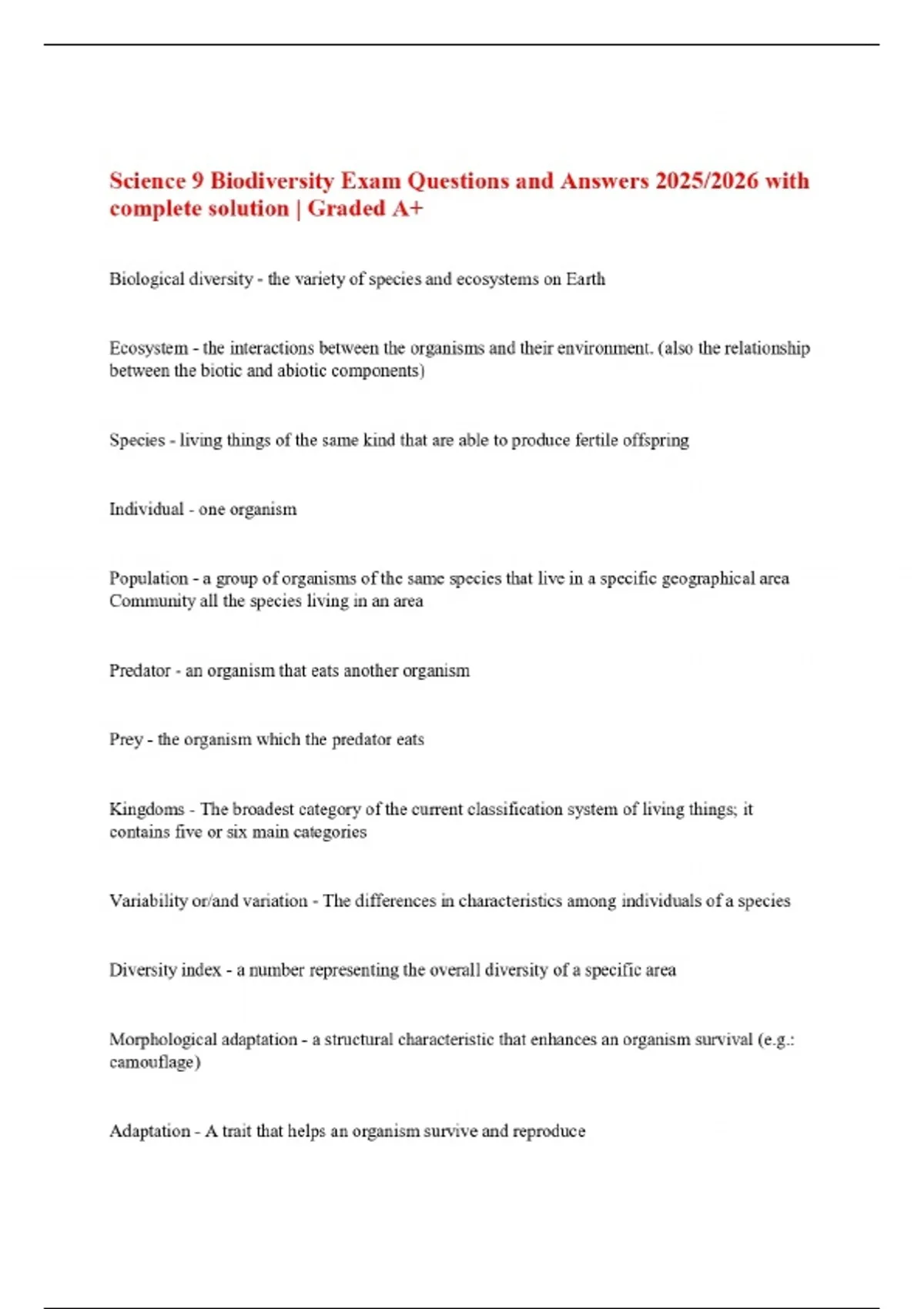 Science 9 Biodiversity Exam Questions and Answers 2025/2026 with complete solution | Graded A+