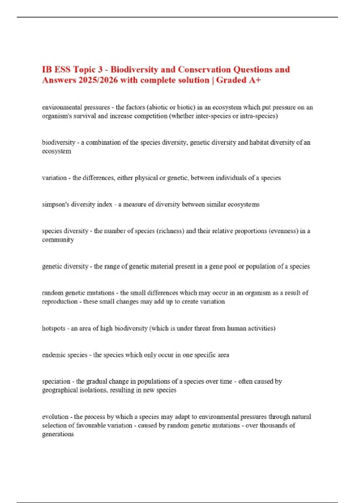 IB ESS Topic 3 - Biodiversity and Conservation Questions and Answers 2025/2026 with complete solution | Graded A+