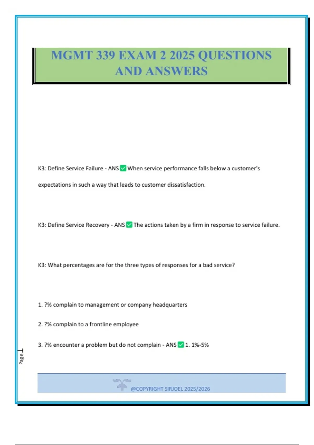 K3: Define Service Failure - ANS When service performance falls below a customer's expectations in such a way that leads to customer dissatisfaction. K3: Define Service Recovery - ANS The actions taken by a firm in response to service failure. K3: What percentages are for the three types of responses for a bad service? 1. ?% complain to management or company headquarters 2. ?% complain to a frontline employee 3. ?% encounter a problem but do not complain - ANS 1. 1%-5% MGMT 339 EXAM 2 2025 QUESTIONS AND ANSWERS @COPYRIGHT SIRJOEL 2025/2026 Page2 2. 45% 3. 50% K3: What is the service recovery paradox? - ANS Even if there's a service failure, if the service recovery is successful, it's very likely the customers will be satisfied and become even more loyal. K3: What are three challenges to service recovery paradox? - ANS 1. Only a small percent of customers complain. 2. Service recovery must be EXCELLENT. 3. Service recovery can be expensive. K3: When is service recovery more likely to occur? - ANS 1. The failure is not considered by the customer to be severe. 2. The customer has not experienced prior failures with the firm. 3. The customer perceives that the company had little control over the cause of the failure. @COPYRIGHT SIRJOEL 2025/2026 Page3 K3: For tangible products, a guarantee is often done in the form of a _______? - ANS warranty K3: Why is it so difficult for customers to return a service? - ANS Services aren't tangible. K3: How can service companies guarantee good service? - ANS Slogan/message with a guarantee. Ex. Starbucks - "Love your beverage or let us know. We'll make it right." K3: What are the three