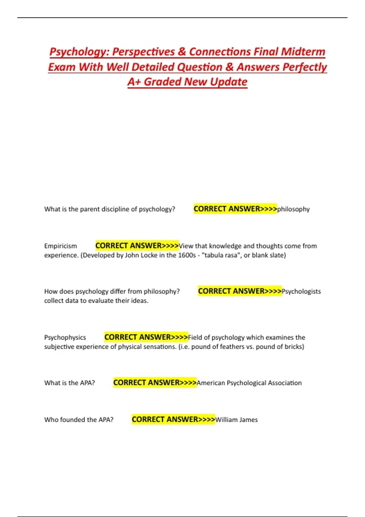 Psychology: Perspectives & Connections Final Midterm Exam With Well Detailed Question & Answers Perfectly A+ Graded New Update Psychology: Perspectives & Connections Final Midterm Exam With Well Detailed Question & Answers Perfectly A+ Graded New Update