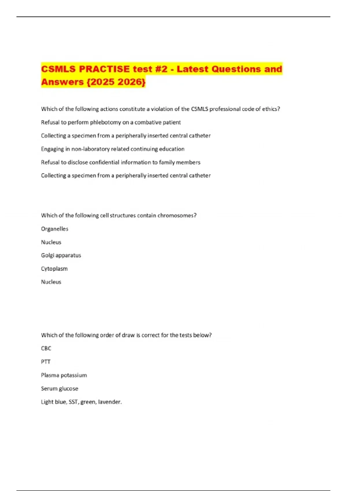 CSMLS PRACTISE test #2 - Latest Questions and Answers {}