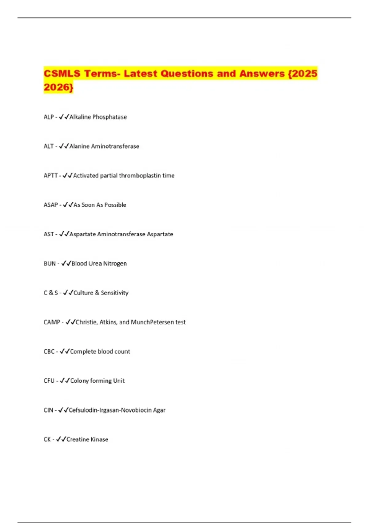 CSMLS Terms- Latest Questions and Answers {2025 2026}