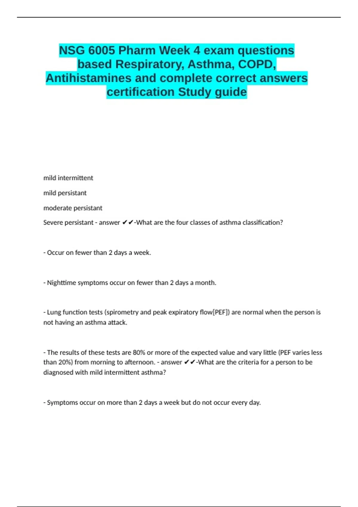 NSG 6005 Pharm Week 4 exam questions based Respiratory, Asthma, COPD, Antihistamines and