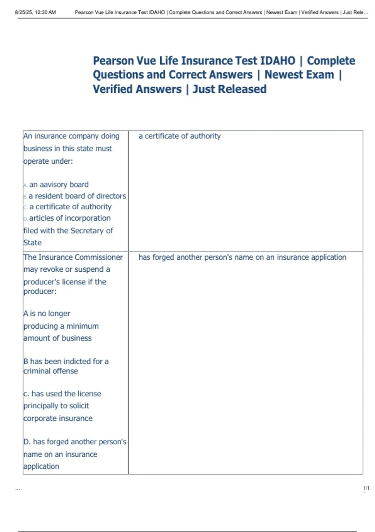, 8/25/25, 12:30 AM Pearson Vue Life Insurance Test IDAHO | Complete Questions and Correct Answers | Newest Exam | Verified Answers | Just Rele…