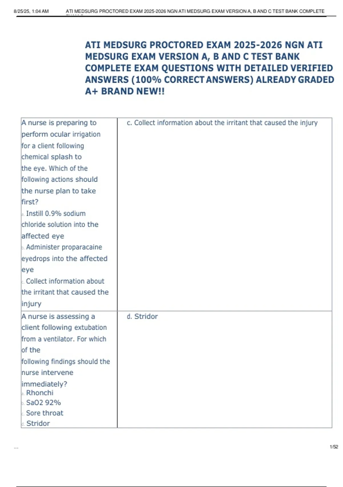 ,8/25/25, 1:04 AM ATI MEDSURG PROCTORED EXAM 2025-2026 NGN ATI MEDSURG EXAM VERSION A, B AND C TEST BANK COMPLETE