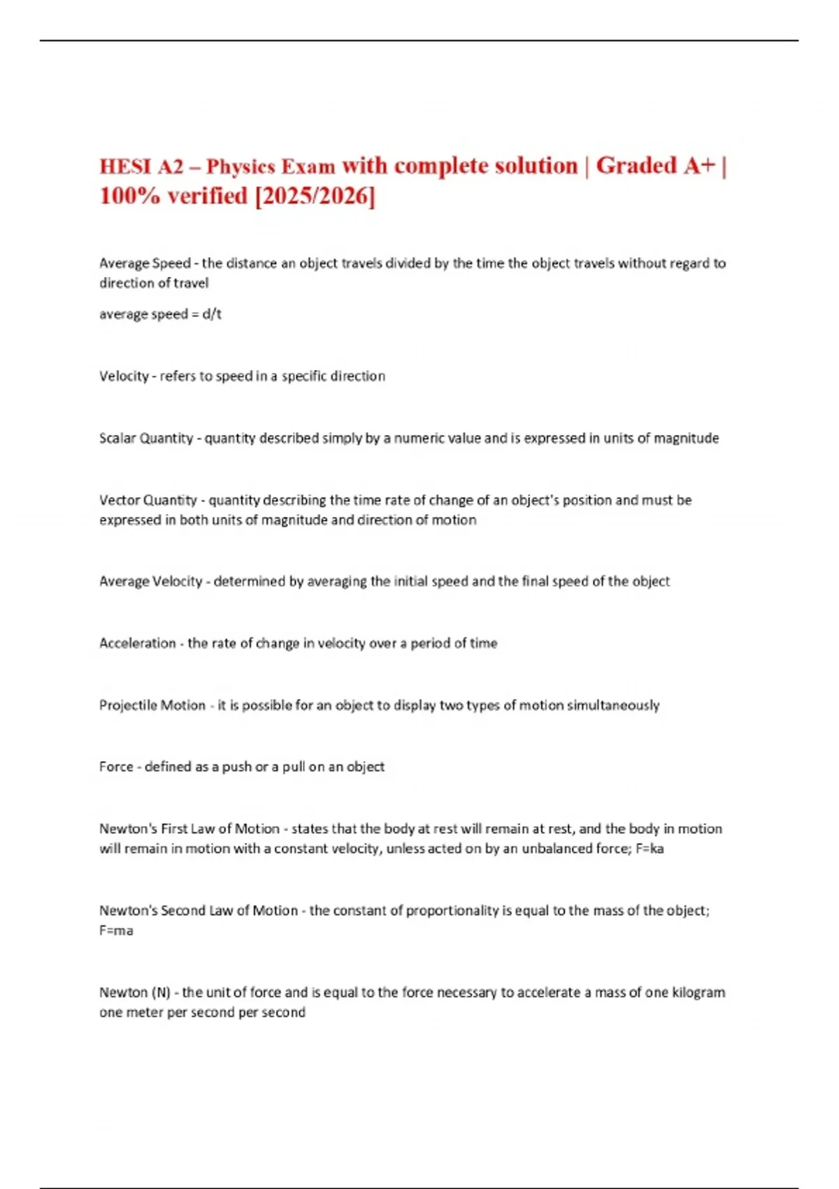 HESI A2 – Physics Exam with complete solution | Graded A+ | 100% verified [2025/2026]
