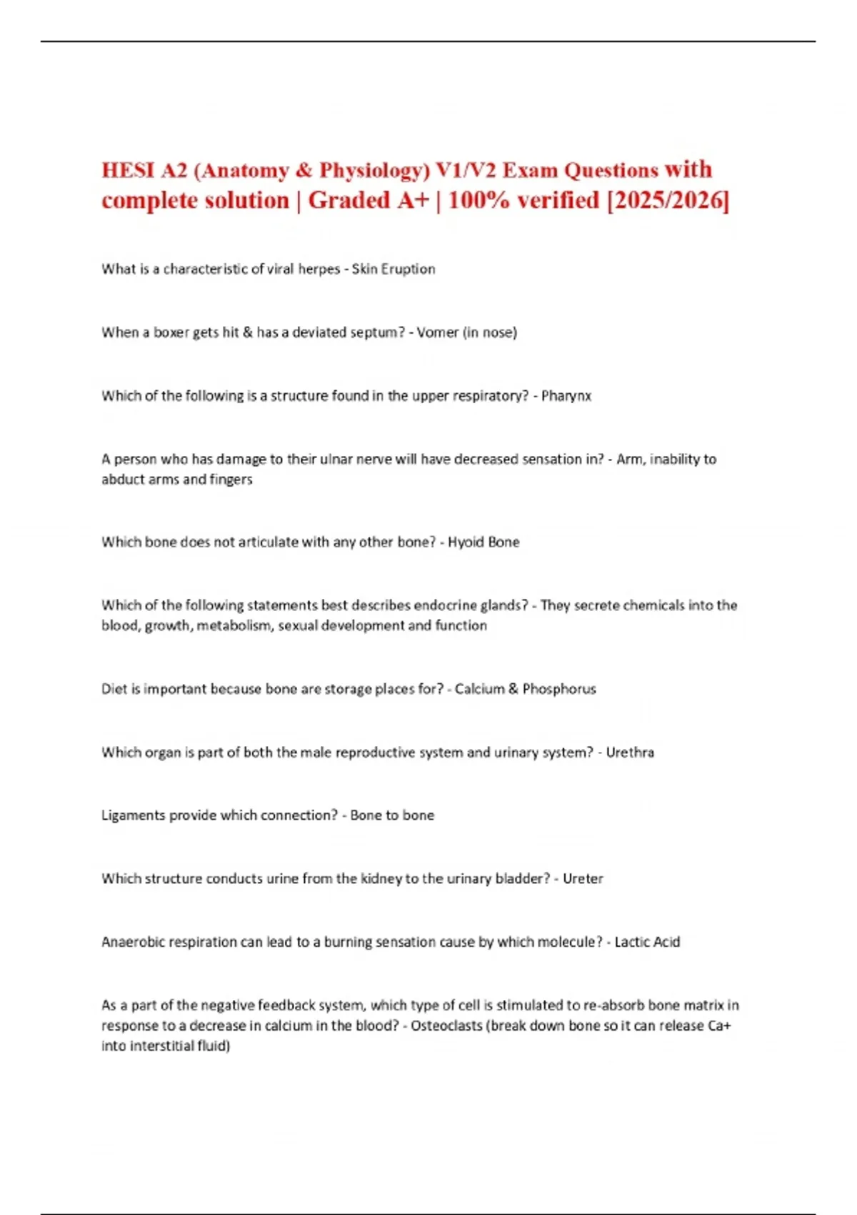 HESI A2 (Anatomy & Physiology) V1/V2 Exam Questions with complete solution | Graded A+ | 100% verified [2025/2026]