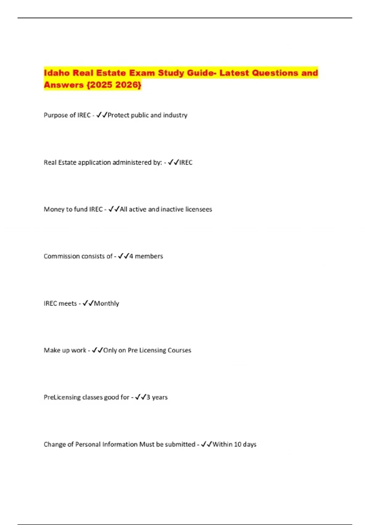 Idaho Real Estate Exam Study Guide- Latest Questions and Answers {}
