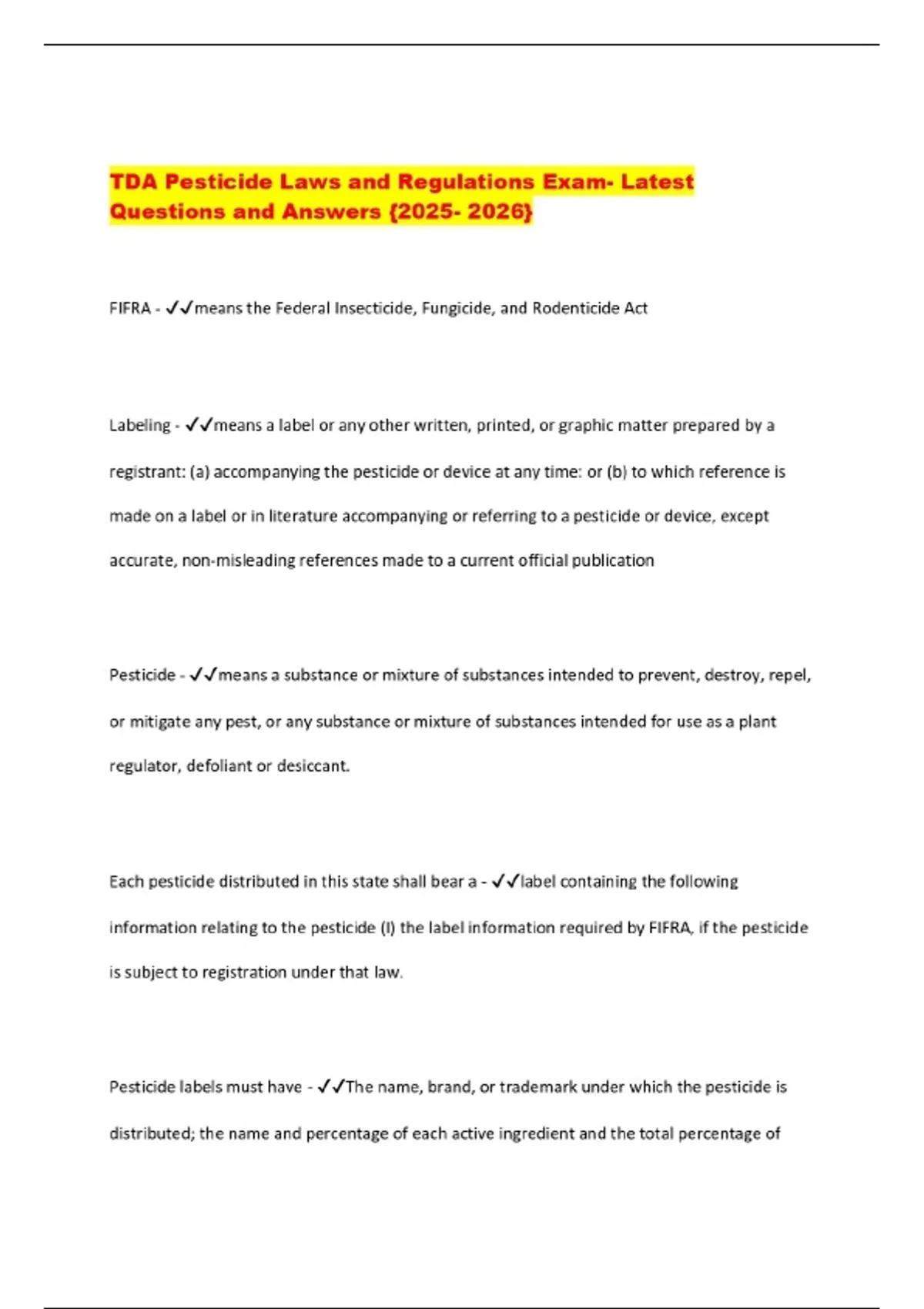 TDA Pesticide Laws and Regulations Exam- Latest Questions and Answers {}
