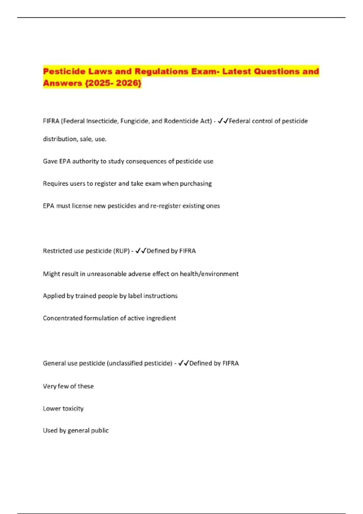 Pesticide Laws and Regulations Exam- Latest Questions and Answers {}