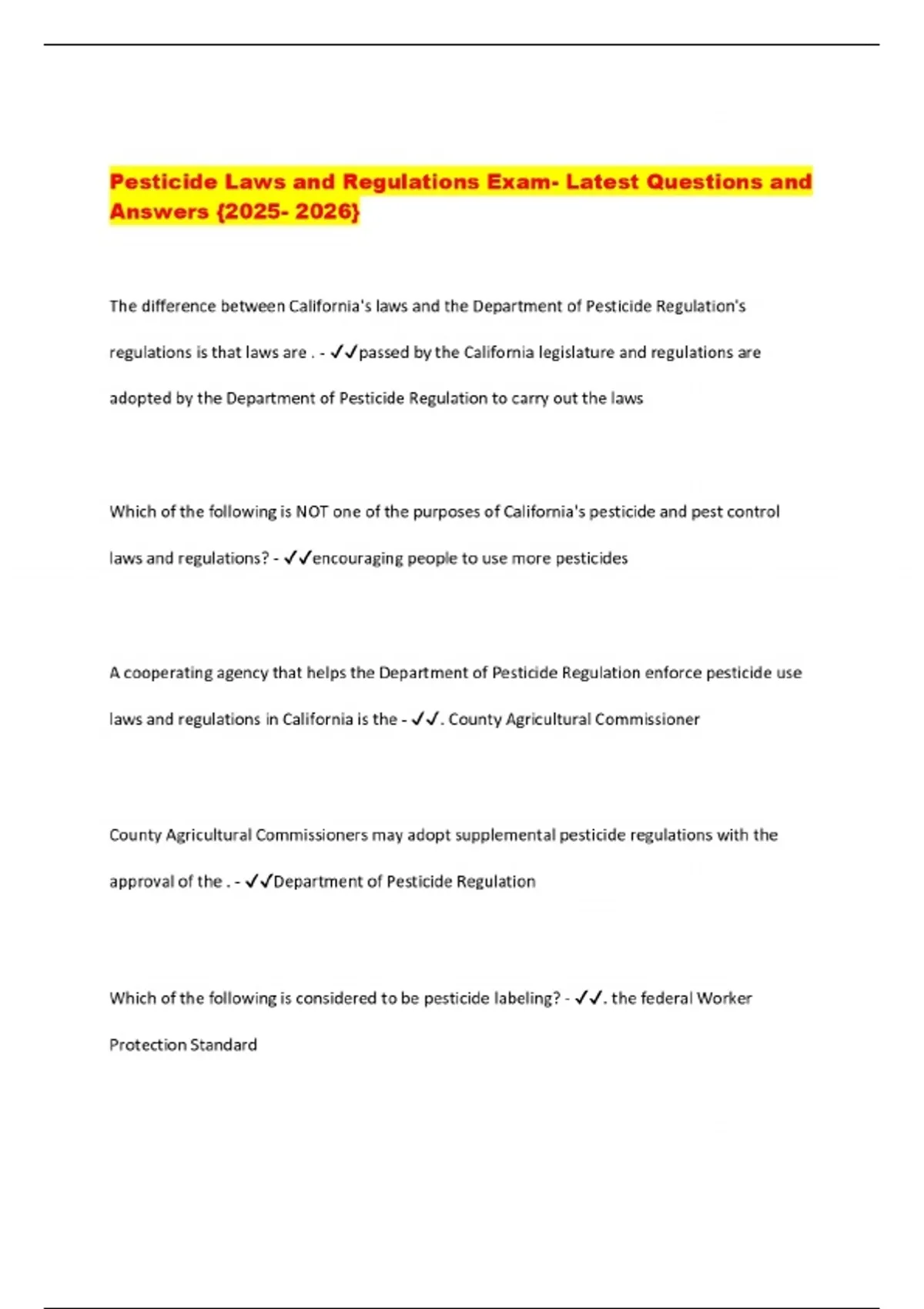 Pesticide Laws and Regulations Exam- Latest Questions and Answers {}