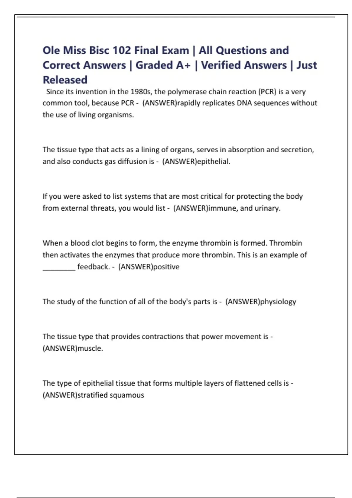 Ole Miss Bisc 102 Final Exam | All Questions and Correct Answers | Graded A+ | Verified Answers | Just Released