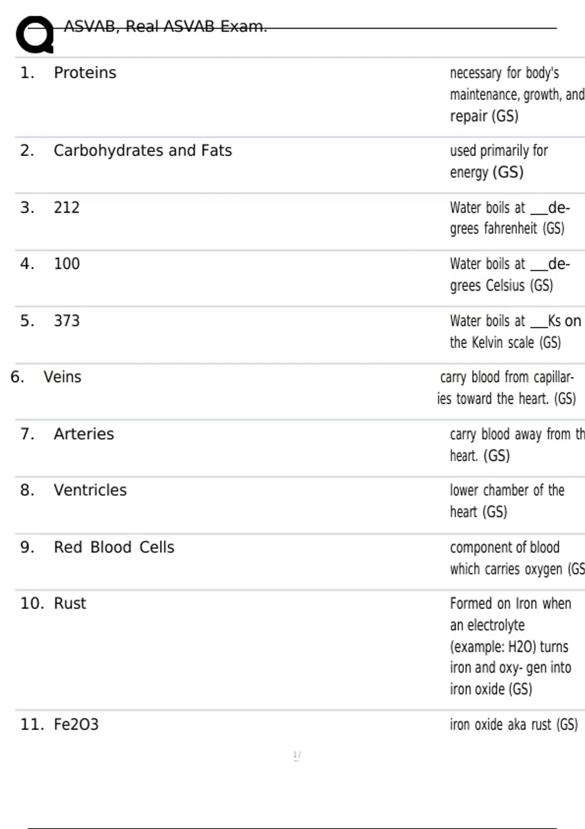 ASVAB, Real ASVAB Exam. 1. Proteins necessary for body's maintenance, growth, and repair (GS) 2. Carbohydrates and Fats used primarily for energy (GS) 3. 212 Water boils at de- grees fahrenheit (GS) 4. 100 Water boils at de- grees Celsius (GS) 5. 373 Water boils at Ks on the Kelvin scale (GS) 6. Veins carry blood from capillar- ies toward the heart. (GS) 7. Arteries carry blood away from the heart. (GS) 8. Ventricles lower chamber of the heart (GS) 9. Red Blood Cells component of blood which carries oxygen (GS) 10. Rust Formed on Iron when an electrolyte (example: H2O) turns iron and oxy- gen into iron oxide (GS) 11. Fe2O3 iron oxide aka rust (GS) 12. Chemical Iron forming rust is an example of a process. (GS) 13. Respiration process by which animals convert oxygen and sug- ars into carbon dioxide and water (GS) 14. photosynthesis process by which plants convert carbon dioxide and water into oxygen and sugar (GS) 15. Inert Noble Gases Helium and neon are ex- amples of , and do not react chemically. (GS) 16. Solution When sugar and water are mixed together, they form a , in which the sugar particles be- come evenly distributed throughout the water. This is not chemical, as sugar can be restored by boiling the water. (GS) 17. Does Not Ice (Does/Does Not) alter the chemistry of H2O. (GS) 18. O Negative Type of blood which can be given to anybody with- out an adverse reaction (universal donor) (GS)