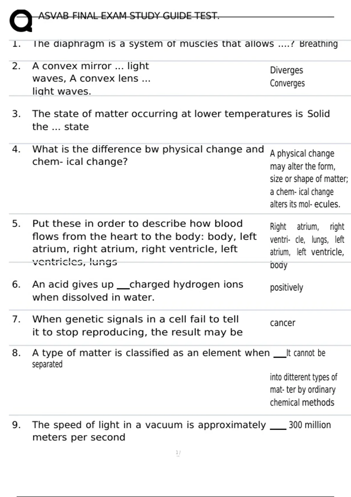 ASVAB FINAL EXAM STUDY GUIDE TEST. 1. The diaphragm is a system of muscles that allows ....? Breathing 2. A convex mirror ... light waves, A convex lens ... light waves. Diverges Converges 3. The state of matter occurring at lower temperatures is Solid the ... state 4. What is the difference bw physical change and chem- ical change? 5. Put these in order to describe how blood flows from the heart to the body: body, left atrium, right atrium, right ventricle, left ventricles, lungs 6. An acid gives up charged hydrogen ions when dissolved in water. 7. When genetic signals in a cell fail to tell it to stop reproducing, the result may be A physical change may alter the form, size or shape of matter; a chem- ical change alters its mol- ecules. Right atrium, right ventri- cle, lungs, left atrium, left ventricle, body positively cancer 8. A type of matter is classified as an element when It cannot be separated into ditterent types of mat- ter by ordinary chemical methods 9. The speed of light in a vacuum is approximately 300 million meters per second 10. What is inertia?