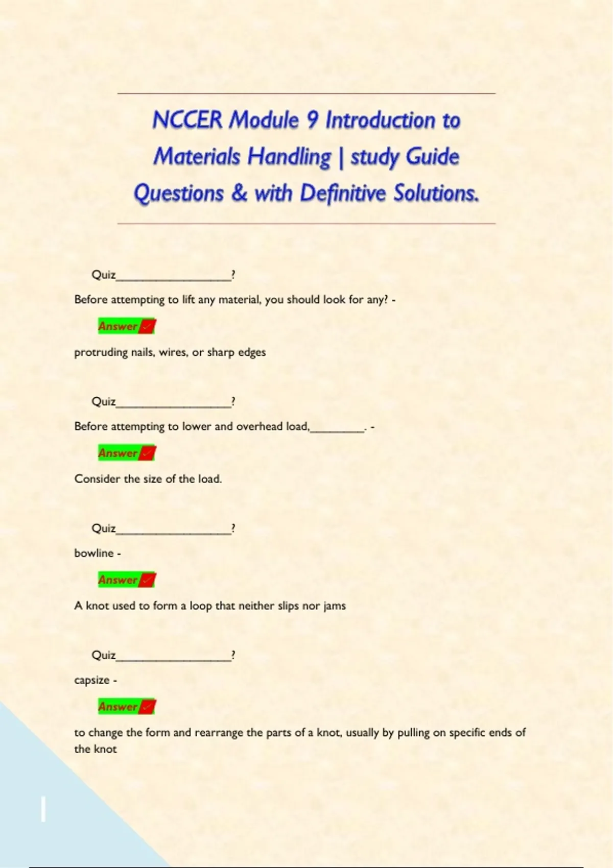 NCCER Module 9 Introduction to Materials Handling | study Guide Questions & with Definitive Solutions. Quiz_________________? Before attempting to lift any material, you should look for any? - Answer protruding nails, wires, or sharp edges Quiz_________________? Before attempting to lower and overhead load,________. - Answer Consider the size of the load. Quiz_________________? bowline - Answer A knot used to form a loop that neither slips nor jams Quiz_________________? capsize - Answer to change the form and rearrange the parts of a knot, usually by pulling on specific ends of the knot Quiz_________________? Clove hitch - Answer A knot that consists of two half hitches made in opposite directions; used to temporarily secure a rope to an object Quiz_________________? concrete mule - Answer a wheeled device used when a concrete pour is in a location that a concrete delivery truck or pump cannot reach Quiz_________________? drum carts - Answer wheeled carts that are used to transport heavier-weight 55-gallon barrels