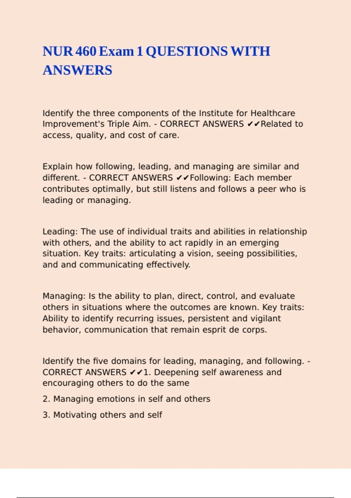 NUR 460 Exam 1 QUESTIONS WITH