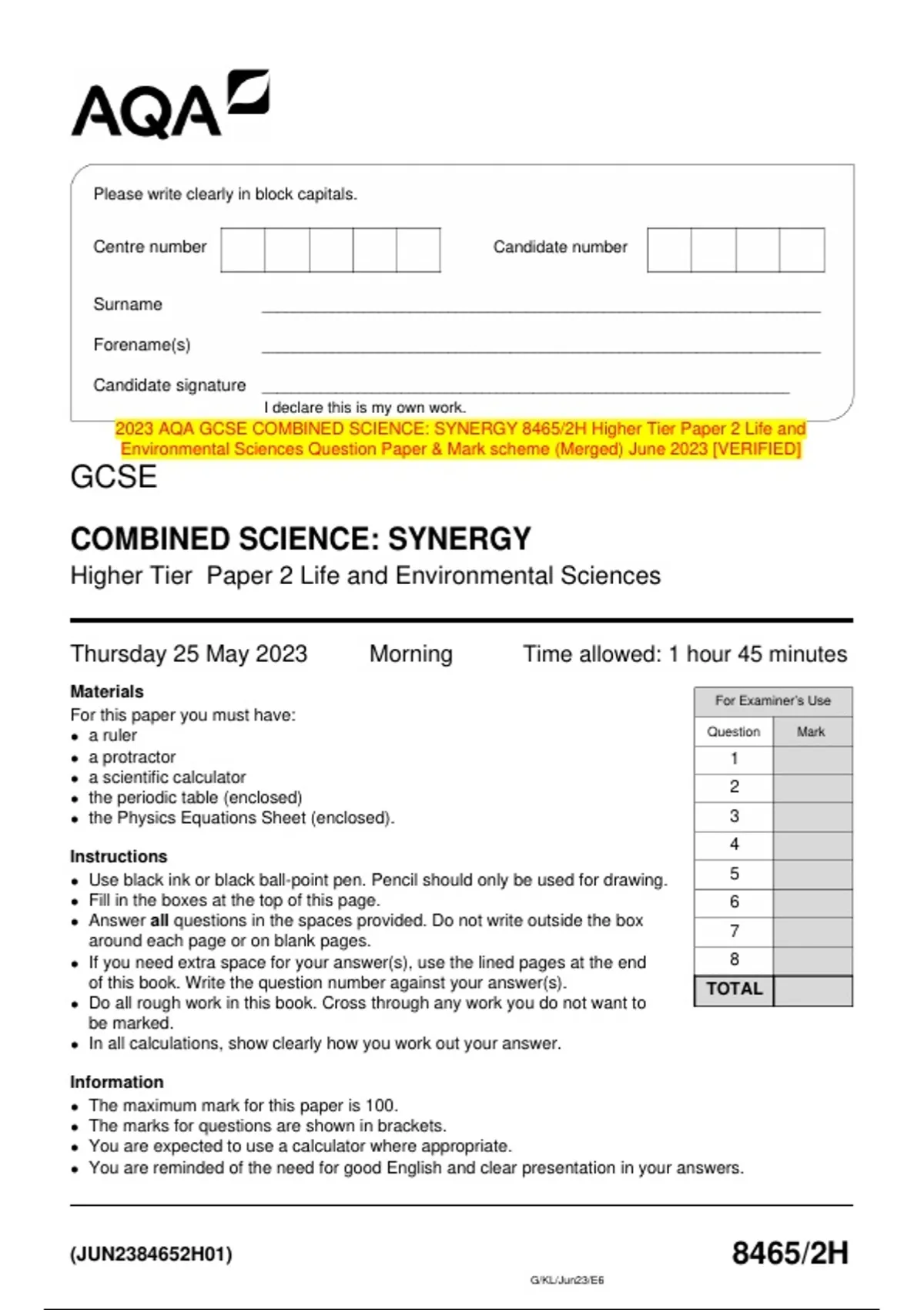 2023 AQA GCSE COMBINED SCIENCE: SYNERGY 8465/2H Higher Tier Paper 2 Life and