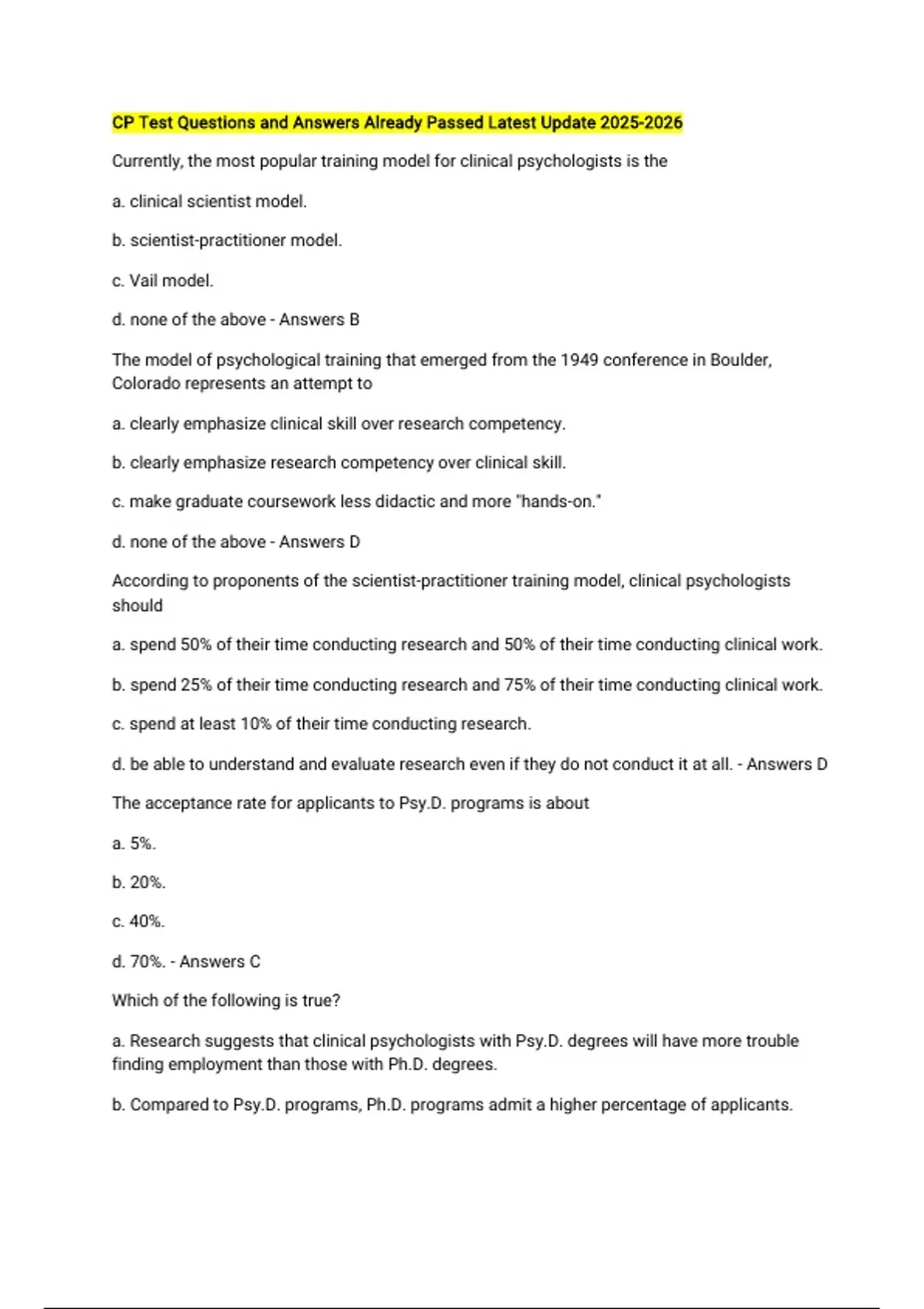 CP Test Questions and Answers Already Passed Latest Update Currently, the most popular training model for clinical psychologists is the a. clinical scientist model. b. scientist-practitioner model. c. Vail model. d. none of the above - Answers B The model of psychological training that emerged from the 1949 conference in Boulder, Colorado represents an attempt to a. clearly emphasize clinical skill over research competency. b. clearly emphasize research competency over clinical skill. c. make graduate coursework less didactic and more "hands-on." d. none of the above - Answers D According to proponents of the scientist-practitioner training model, clinical psychologists should a. spend 50% of their time conducting research and 50% of their time conducting clinical work. b. spend 25% of their time conducting research and 75% of their time conducting clinical work. c. spend at least 10% of their time conducting research. d. be able to understand and evaluate research even if they do not conduct it at all. - Answers D The acceptance rate for applicants to Psy.D. programs is about a. 5%. b. 20%. c. 40%. d. 70%. - Answers C Which of the following is true? a. Research suggests that clinical psychologists with Psy.D. degrees will have more trouble finding employment than those with Ph.D. degrees. b. Compared to Psy.D. programs, Ph.D. programs admit a higher percentage of applicants. c. Compared to Psy.D. programs, Ph.D. programs award more doctoral degrees. d. none of the above - Answers D Elena and Jacquelyn are each pursuing higher degrees in clinical psychology: Elena a Ph.D. and Jacquelyn a Psy.D. Compared to Jacquelyn's program, students in Elena's program ar